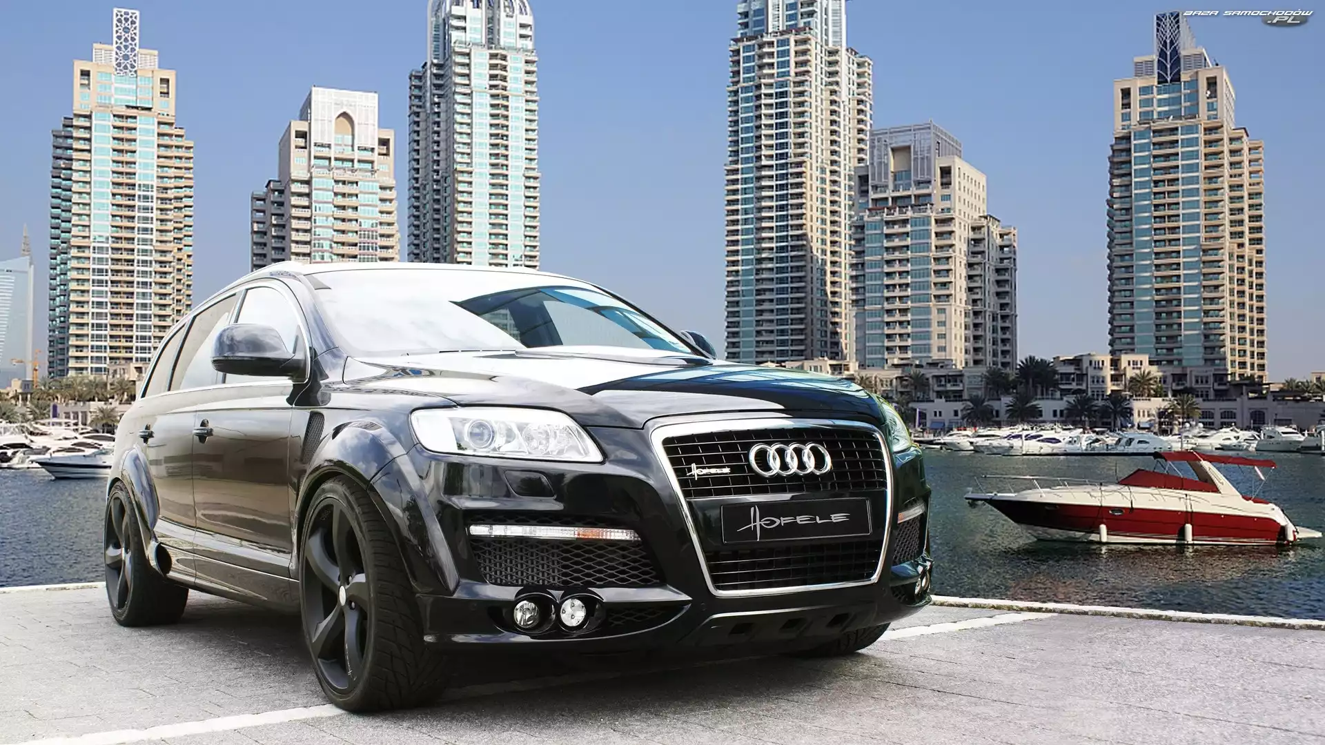 Samochód: Łódka, Rzeka, Wieżowce, Audi Q7, Miasto